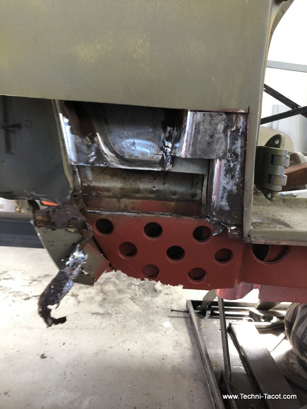 Les renforts sous plancher et sous l’unité avant sont eux aussi perforés et réduits à de la dentelle. Des découpes sont réalisées jusqu’au métal sain. Comme les pièces de tôlerie sont quasiment inexistantes sur ce véhicule, nous devons former à la demande toutes ces pièces. Entre-nous, nous préférons fabriquer NOS pièces que passer des heures à essayer de monter tant bien que mal des « adaptables » . Je dis ça, je dis rien 😉
