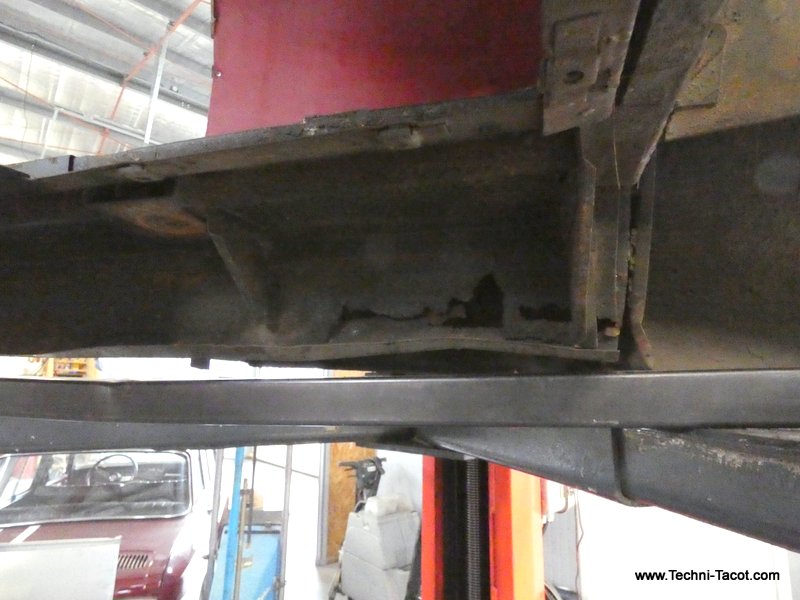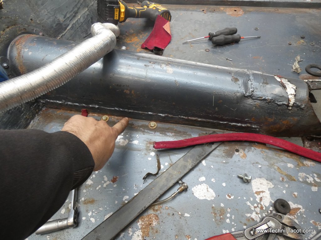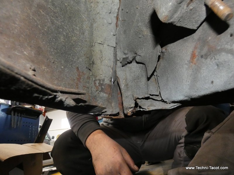 L’intérieur du coffre et notamment le fond a reçu une tôle soudée à la fois sur la carrosserie et le châssis.(me suis trompé chef, j’ai tout soudé !). La dépose s’est faite au ciseau affuté, sans dégât car le soudeur manquait d’expérience visiblement.