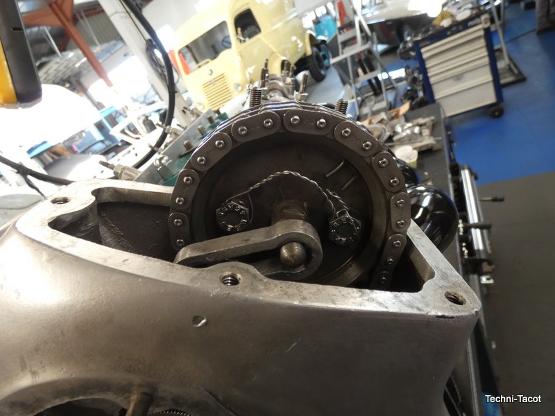 Une étape minutieuse et un ordre à respecter pour ne pas avoir à tout re démonter. La précision du calage de chaque arbre à cames est possible grâce à leur pignons crantés. On décrante, on vérifier et on bloque ou on décrante un peu plus. La pose de la culasse se fait toujours avec les arbres à cames aux repères, et le moteur en PMH sur cylindres 1 et 6.