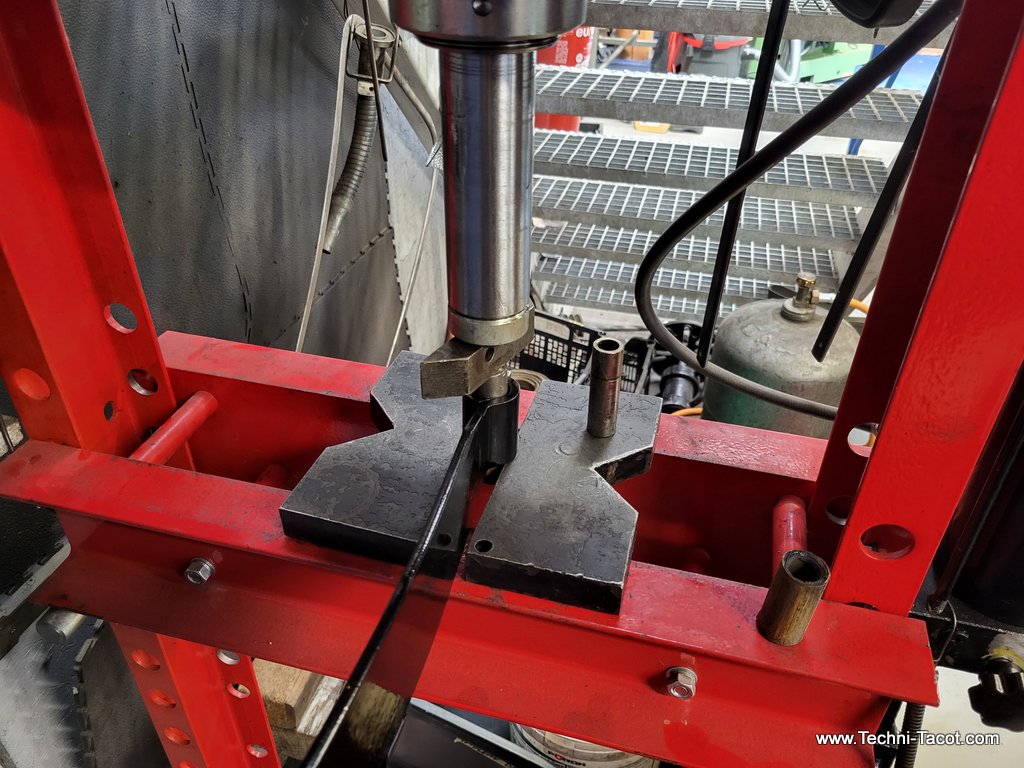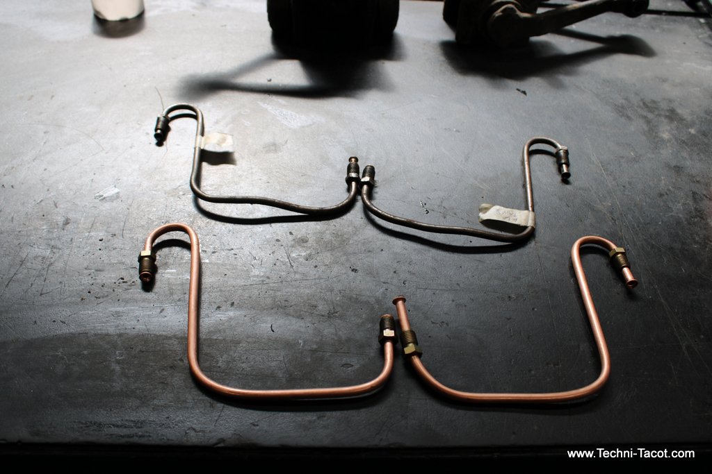 Le freinage est récent, mais … comment faire confiance à des pièces dont ne connait pas l’origine (je resterai discret sur ce qu’on trouve sur le marché et les déboires qui en découlent). Donc nous remplaçons tout y compris les mâchoires. Nous en profitons pour refaire toutes les canalisations de hydrauliques , ce qui supprimera le problème des dépôts qui se décollent à la remis en route et qui viennent se loger sous les coupelles, créant ainsi les suintements à court terme.
