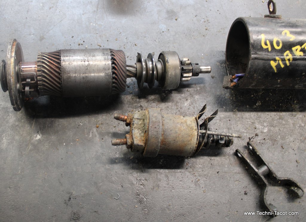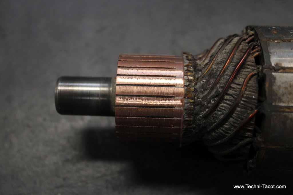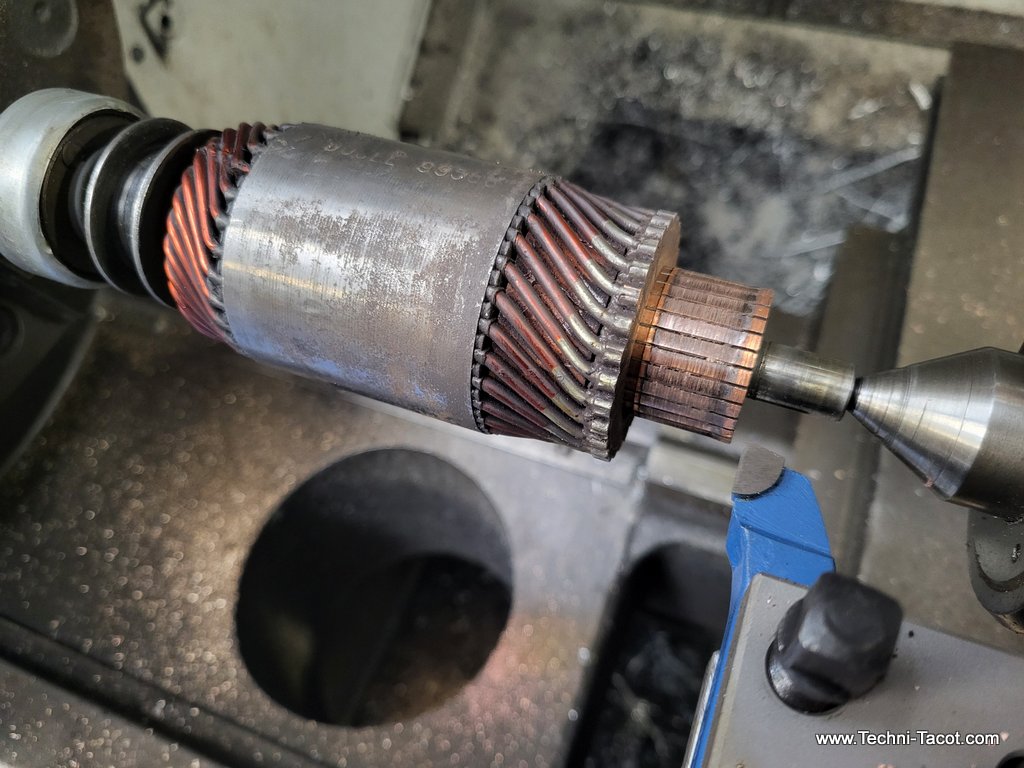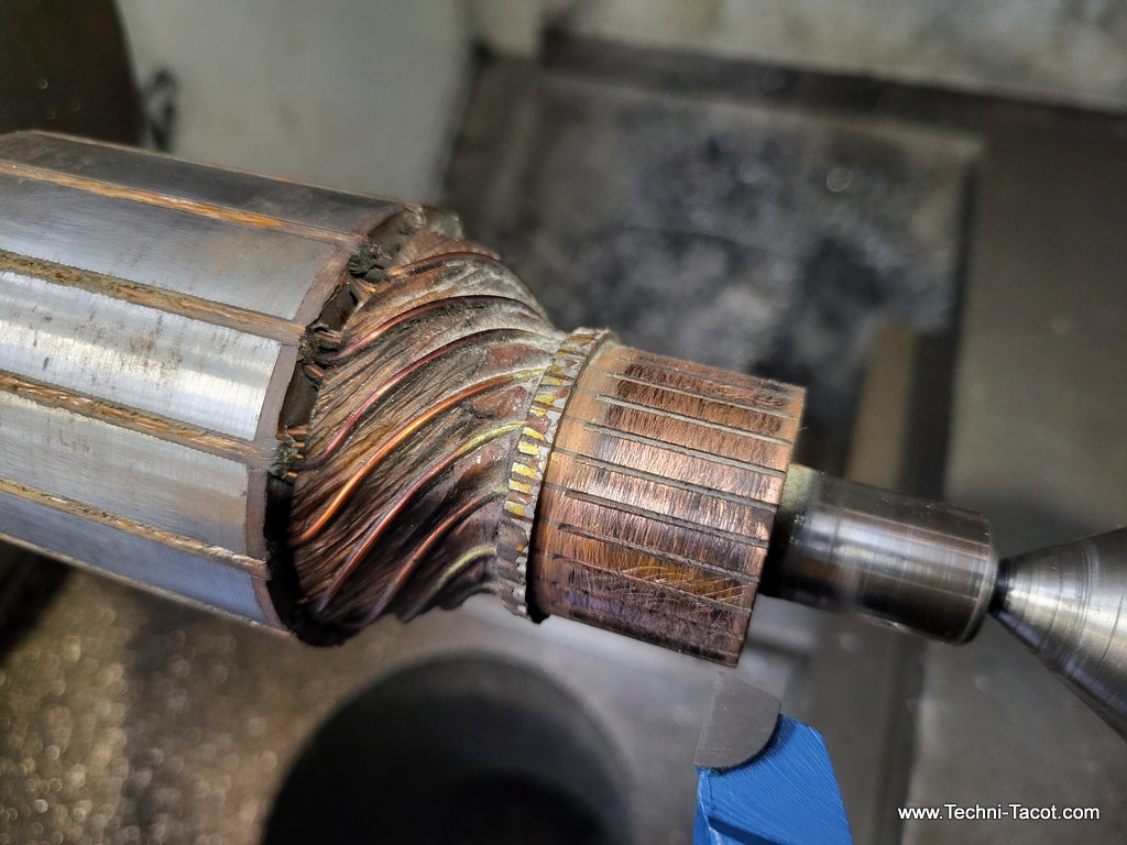 Deux machine dites à « courant tournant » dont il faut vraiment prendre soin. Je commence par ouvrir et sortir les induits. Les photos sont on ne peut plus explicites : les induits sont à rectifier. Les charbons sont remplacés ainsi que bague palier et (ou) roulement pour l’avant de la dynamo notamment.