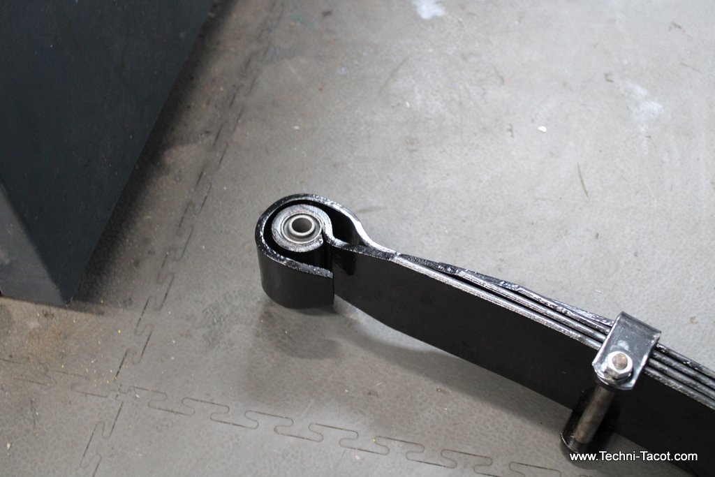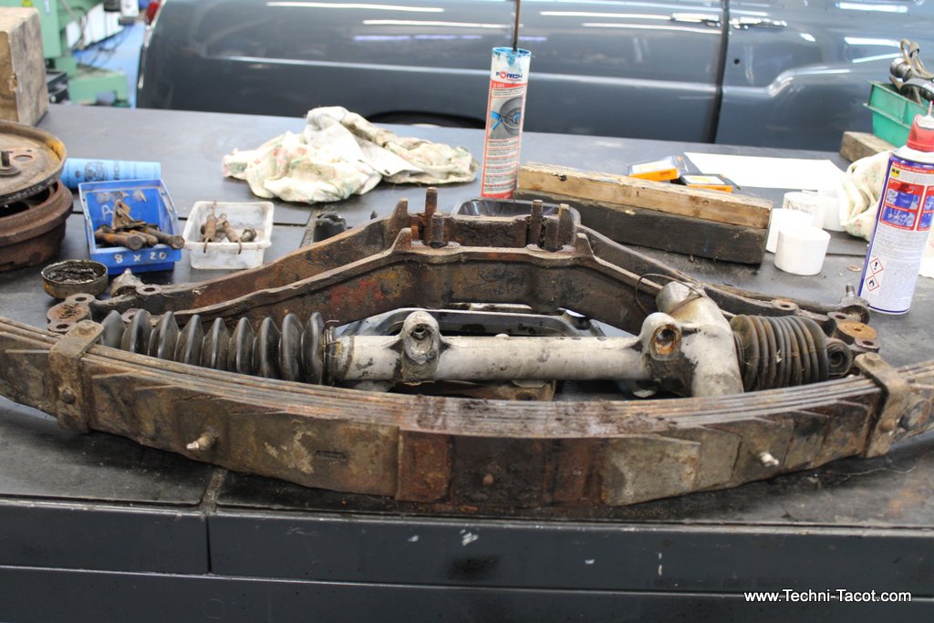 Une des lames de suspension est brisée, nous la remplaçons par une autre prélevée sur une donneuse (rassurez vous c’est une berline et non pas un cabriolet)