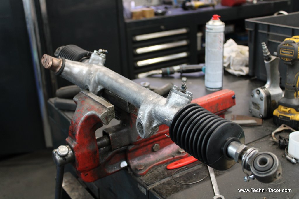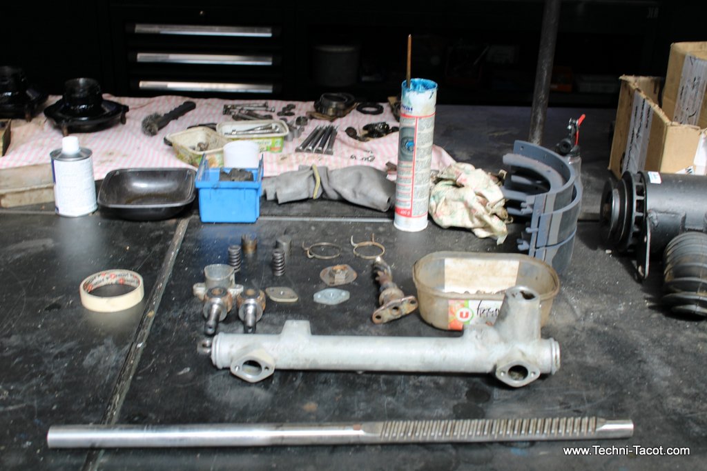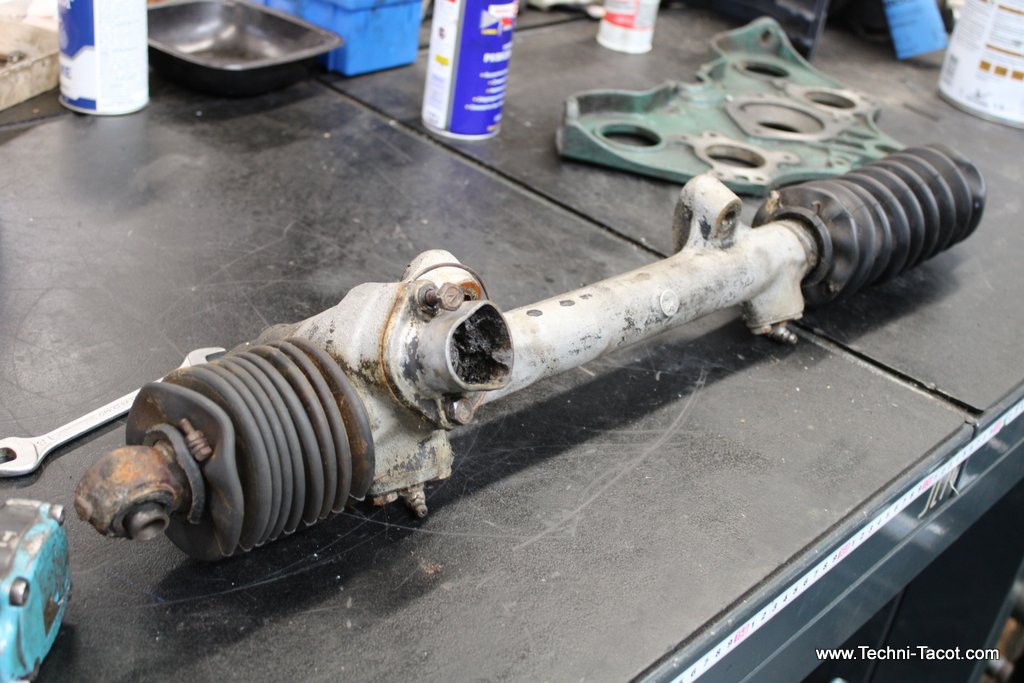 La crémaillère est mise à nue. Comme en bon état, elle sera remontée avec soin pour de longues années de très bon service. Nous remplaçons TOUS les silent-blocs (suspension amortisseurs et crémaillère)
