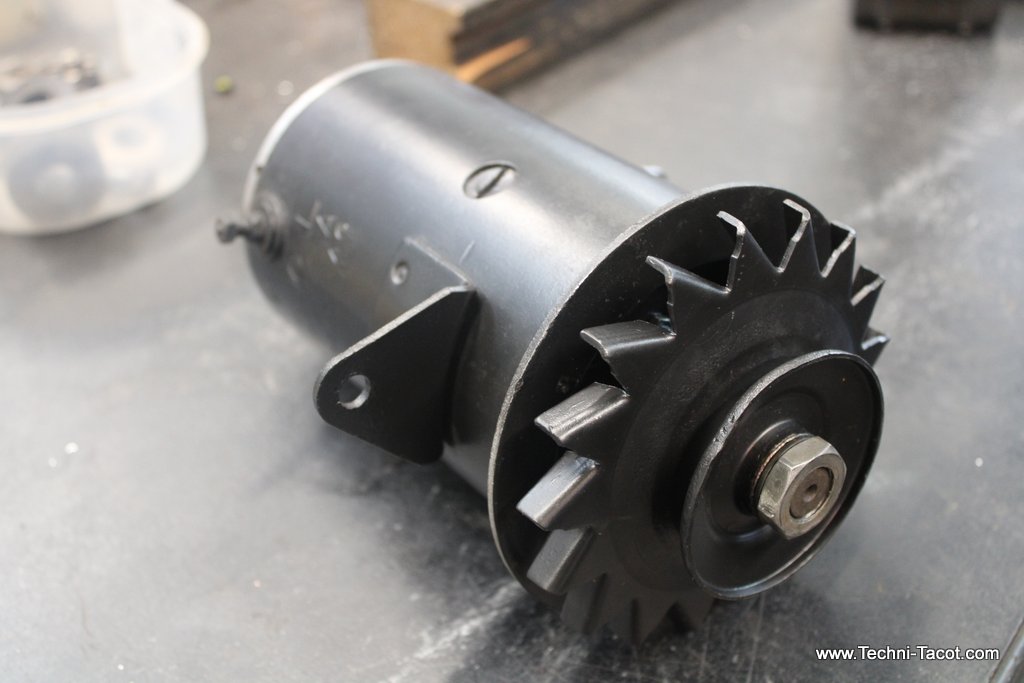- modification du système électrique avec montage d’un alternateur caché dans le corps d’une dynamo. Ceci permettra de conserver l’aspect esthétique et de recharger la batterie lorsque le moteur tourne au ralenti – De plus la production d’énergie électrique avec un alternateur offre une tension de 14v5, ce qui donne un éclairage plus brillant (meilleure visibilité), des essuies glace plus rapides, un désembuage de pare brise efficace, …
